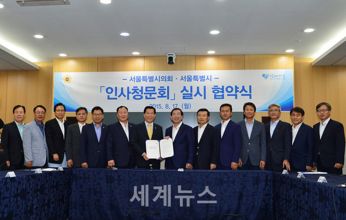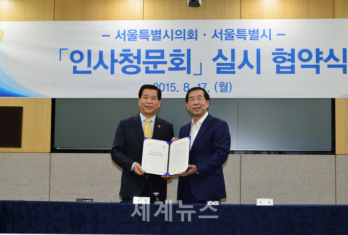박원순 시장과 박래학 의장은 17일 오후3시10분 신청사 6층 영상회의실에서 ‘인사청문회 실시 협약식’을 열고 이러한 합의 내용을 담은 협약을 체결했다.