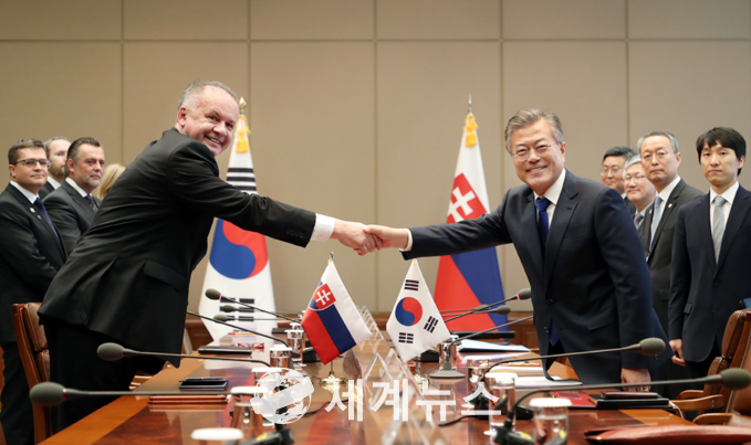 [세계뉴스] 탁병훈 기자 = 문재인 대통령은 10일 오전 11시 30분부터 12시 35분까지 본관 충무실에서 슬로바키아 대통령으로서는 최초로 공식 방한한 안드레이 키스카(Andrej Kiska) 대통령과 정상회담을 갖고 경제협력, 과학기술‧R&D 협력 등 양국관계 발전방안과 국제무대에서의 협력에 대해 의견을 교환했다.