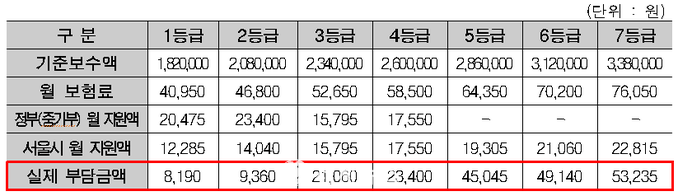 ▲ 기준보수 등급별 보험료 및 월 지원액. |