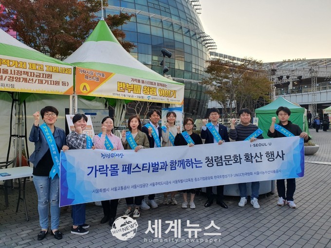[세계뉴스 전승원 기자] 서울시농수산식품공사(사장 김경호)는 지난 11~12일 양일간 열린 ‘2019년 가락시장 가락몰 페스티벌’에서 유통인과 시민을 대상으로 ‘청렴문화 확산 행사’를 가졌다.
