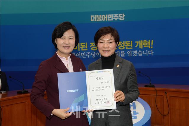 ▲ 추미애 더불어민주당 대표는 김미경(오른쪽) 서울시의원에게 중앙당 부대변인 임명장을 수여했다 © 세계뉴스 |