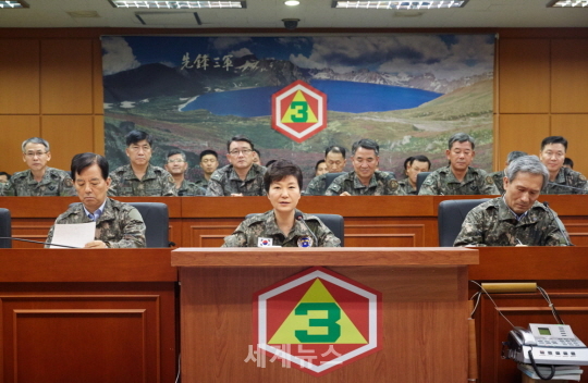 ▲ 박근혜 대통령의 3군사령부 방문에는 김관진 국가안보실장, 이병기 비서실장, 박흥렬 경호실장, 한민구 국방부장관, 신원식 합동참모회의 차장, 장혁 국방비서관 등이 수행했다. 이날 박 대통령은 북한의 추가 도발에는 '선조치 후보고' 원칙대로 응징하라고 지시했다. © 세계뉴스 |