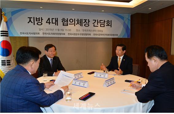 전국시도의회의장협의회(회장 박래학 서울특별시의회의장), 전국시도지사협의회(회장 유정복 인천광역시장), 전국시장군수구청장협의회(회장 조충훈 순천시장), 전국시군자치구의회의장협의회(회장 천만호 부산동래구의회의장) 등 지방4대협의체의 대표들은 9일 오후3시 한국프레스센터 간담회에서 전국적 지방자치단체 연합체를 구성하는데 합의했다.