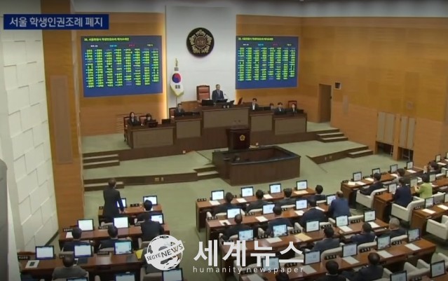 [세계뉴스 윤소라 기자] 서울시의 학생인권조례가 12년 만에 폐지됐다. 서울시교육청은 “전국의 학생 인권 후퇴로 이어질 것”이라며 거세게 반발했고, 재의요구권(거부권)도 행사할 계획이다. 이와 관련, 야권은 국회에서 법제화를 검토하고 있다.