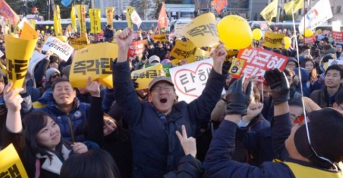 ▲ 박근혜 대통령에 대한 국회의 탄핵안이 가결된 9일 오후 개표 결과가 발표되자 국회를 포위하고 있던 시민들이 탄핵가결을 환영하며 "대한민국 만세"를 외치고 있다. © 세계뉴스 |