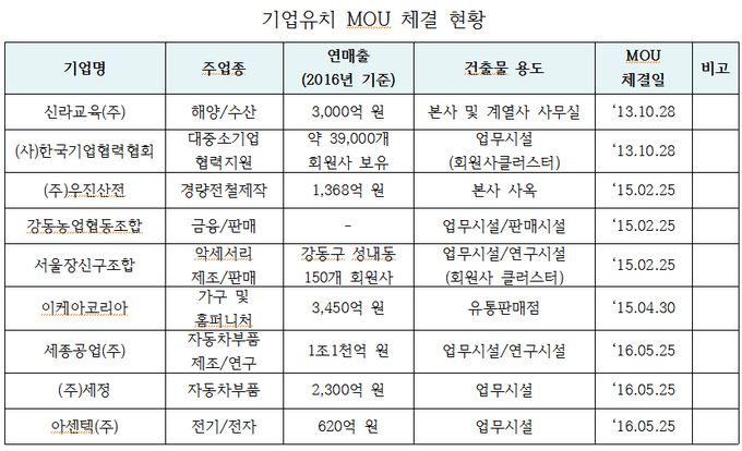 ▲ 이정훈 서울시의원이 MOU 체결한 기업유치 현황. © 세계뉴스 |