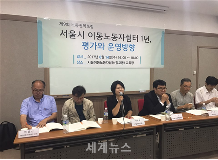 [세계뉴스] 전승원 기자 = 서울시의회 이윤희 의원(더불어민주당, 성북1)은 14일 서울시 중구 장교동 休이동노동자쉼터에서 노동권익센터(센터장 문종찬)가 개최한 ‘서울시 이동노동자쉼터 평가와 운영방안’ 토론회에 참석했다.