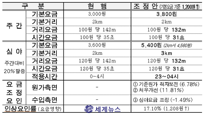 "심야요금 3,600원에서 5,400원으로 50% 인상안 제출"