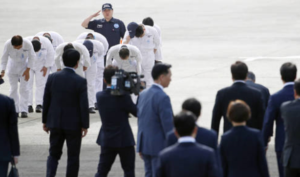 이날 문 대통령은 트랩을 지나쳐 전용기 한편에 서 있던 정비사들을 향해 90도로 고개를 숙여 인사했다. 정비사들도 모자를 벗고 문 대통령을 향해 맞은 인사를 건넸다.