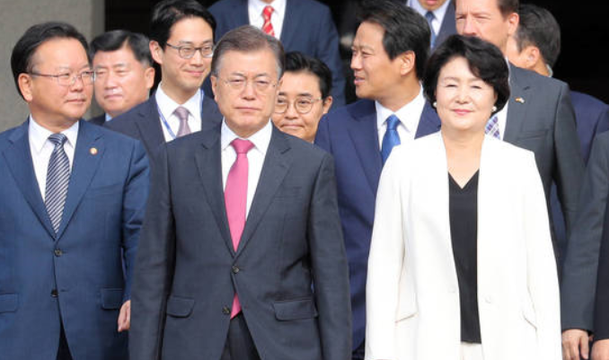 ▲ 문재인 대통령과 부인 김정숙 여사가 5일 독일 공식 방문과 주요 20개국(G20) 정상회의 참석을 위해 전용기에 오르기전 참모들과 서있다. 문 대통령이 북한의 미사일 발사 탓인지 표정이 무겁다. © 세계뉴스 |
