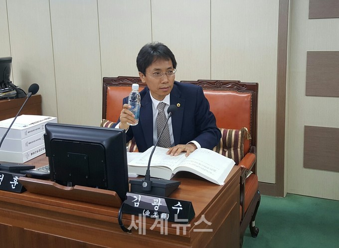 ▲ 김광수 의원이 서울시의회 환경수자원위원회 행정사무감사 (11일) 첫날 상수도본부 영등포아리수정수센터 임정규 소장을 불러 “처음 생산목적과 달리 행사에만 이용되고 있는 현상황”에 대해 질책하고 있다. © 세계뉴스 |