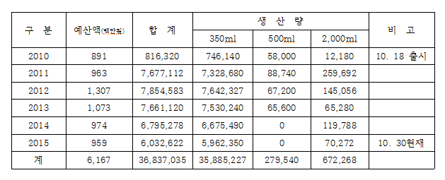 또한 병물아리수는 350ml, 500ml, 2,000ml의 3종류의 생산시설에 이중 생산의 98%는 350ml가 차지하고 있다. 최근 2년 동안은 500ml는 사실상 생산이 중단된 상태다.