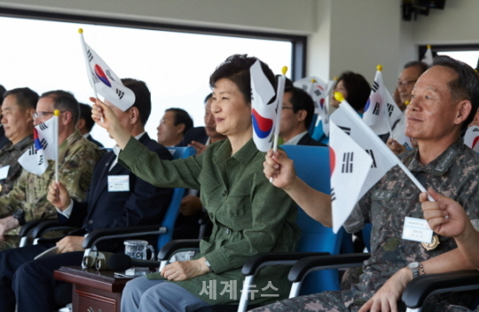 ▲ 박근혜 대통령이 28일 경기도 포천 승진과학화훈련장에서 열린 '2015 통합화력 격멸훈련'에 참석했다. 이날 한미 양국 군 47개 부대 장병 2천여명과 장비 318대가 참가한 역대 최대규모의 화력시범이 펼쳐졌다. © 세계뉴스 |