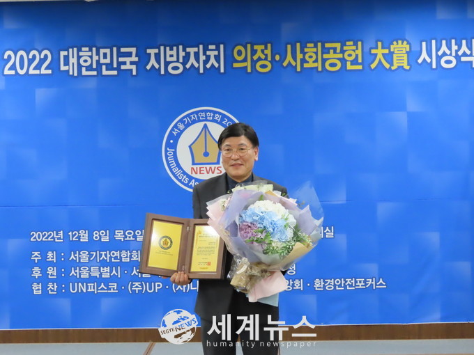 [세계뉴스 전승원 기자] 서울특별시의회 이종환 문화체육관광위원회 위원장(국민의힘, 강북1)은 8일 서울시의회 의원회관 제2대회의실에서 서울기자연합회가 주최한 ‘제15회 2022 대한민국 지방자치 의정·사회공헌 대상’에서 지방자치 의정 부문 대상을 수상했다.