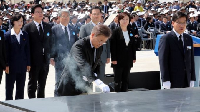 저는 오월의 영령들과 함께 이들의 희생과 헌신을 헛되이 하지 않고 더 이상 서러운 죽음과 고난이 없는 대한민국으로 나아가겠습니다. 참이 거짓을 이기는 대한민국으로 나아가겠습니다.