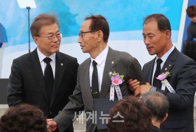 ▲ 문재인 대통령이 6일 오전 서울 동작구 국립서울현충원에서 열린 제62회 현충일 추념식에서 국가유공자인 박용규씨(가운데)를 부축하고 있다. 오른쪽은 아들 박종철씨. © 세계뉴스 |