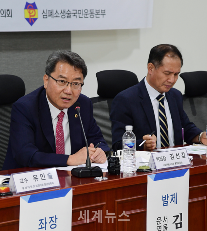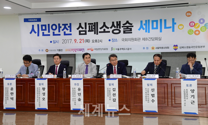 ▲ 21일 국회의원회관에서 개최된 ‘시민안전 심폐소생술 세미나’ 주제발표자인 서울시의회 김선갑 운영위원장(왼쪽)이 옥외전광판을 활용한 심폐소생술 교육의 필요성을 강조하고 있다. © 세계뉴스 |