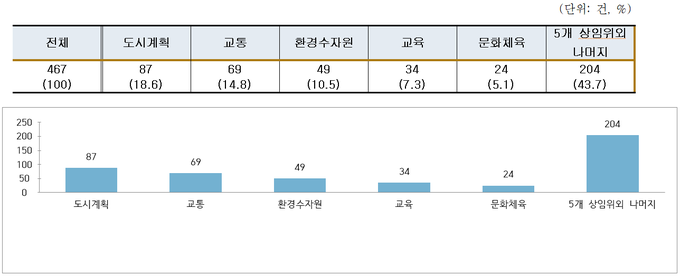 민원의 내용을 상임위원회별로 살펴보면 총 467건 중 재개발, 재건축관련 ‘도시계획관리위원회’ 분야 민원이 87건(18.6%)으로 가장 많았고, 그 다음으로 버스 및 지하철 등 대중교통관련 된 ‘교통위원회’ 69건(14.8%), ‘환경수자원위원회’ 49건(10.5%) 등이 뒤를 이었다.