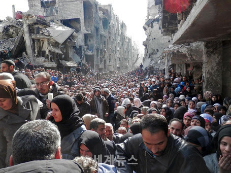 | ▲ 시리아 수도 다마스커스의 난민수용소에서 사람들이 배급품을 받기 위해 줄을 서 있다. © 세계뉴스 |