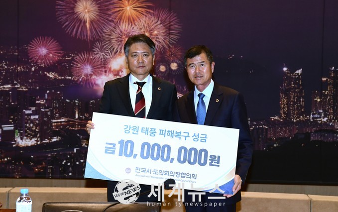 [세계뉴스 정서영 기자] 전국시·도의회의장협의회(회장 신원철, 서울특별시의회 의장)는 제18호 태풍 ‘미탁’으로 피해를 입은 강원도 삼척·강릉시, 경북 울진·영덕·성주군, 경주시, 전남 해남·진도군 지역 이재민들을 돕기 위한 성금을 1일 제8차 임시회에서 각 도에 전달했다.