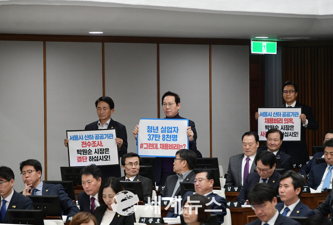 [세계뉴스] 전승원 기자 = 제10대 서울시의회의 제284회 정례회 첫날인 1일 오후 2시 30분경 자유한국당 소속 6명이 일제히 서울교통공사의 채용비리 의혹을 규탄했다.