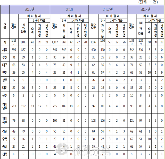 ▲ 2015~2018년 지방청별 교통사고 조사 이의신청 현황. |