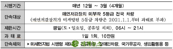 ‘미세먼지 계절관리제’ 5등급 차량 상시운행제한은 12월~3월 중 평일 06시부터 21시까지다. 매연저감장치가 부착되지 않은 모든 5등급 차량이 단속대상이며, 10만 원의 과태료가 부과된다.