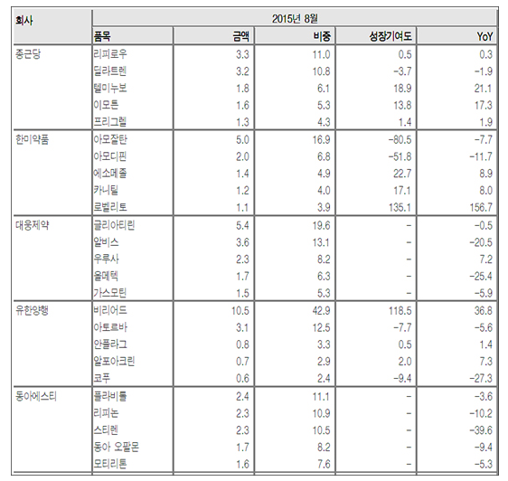 그러나 동아ST 스티렌(-40%), 대웅제약 알비스(-20.5%) 등 마진이 높은 주력품목들은 제네릭 진입 등으로 인해 고전하고 있다.