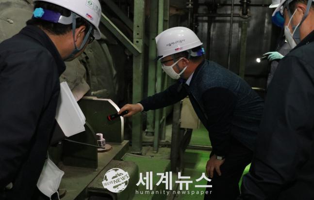 | ▲ 김중식 서울에너지공사 사장(가운데)이 손전등을 비춰가며 설비를 면밀히 살펴보고 있다. |