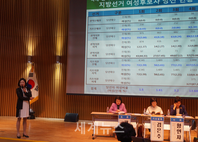 이어 ‘여성지방의원현황과 대표성확대방안’을 주제로 “그동안 여성의무할당제도입으로 여성의원의 비중이 광역의회 8.3%, 기초의회 23.7% 양적으로 증가하였지만 주로 비례대표에서의 비중이 증가한 것이라며 지역구에서의 여성비율은 여전히 낮은 것이 현실”이라고 설명했다.