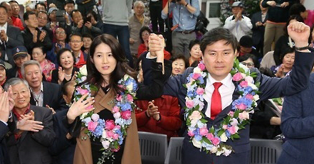 ▲ 지상욱 새누리당 중구성동구을 후보와 아내 배우 심은하씨와 당선이 확정되자 손을 치켜들고 있다. @세계뉴스 |