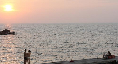 ▲ 꼬사멧 남쪽 끝 끼우 해변 선창에서 방문객들이 해넘이를 감상하고 있다. © 세계뉴스 |