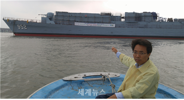 ▲ 3일 행주대교 앞 현장을 찾은 김광수 서울시의원이 멈춰서버린 서울함을 손으로 가르키고 있다. © 세계뉴스 |