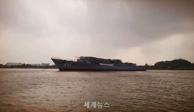 ▲ 지난달 27일 서울 망원한강공원에 조성 중인 함상공원으로 향하던 해군 퇴역함정 서울함이 양주대교 인근 모래톱에 걸려 발이 묶여있다. 2017.7.3. © 세계뉴스 |