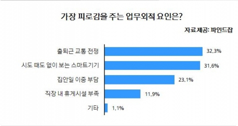 이어 ‘시도 때도 없이 보는 스마트 기기’(31.6%)가 2위에 올라 스마트폰 4000만 시대의 새로운 피로 요인으로 대두됐고, ‘집안일 이중부담’(23.1%), ‘직장 내 휴게시설 부족’(11.9%) 순으로 이어졌다.