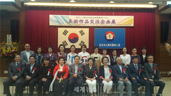 ▲ 12일 진두생(앞줄 왼쪽에서 5번째) 서울시의원은 재일본한국중앙회관 대홀에서 열린 ‘맑고 매력 있는 세계도시 서울’ 미술작품 교류기획전에 참석, 재일본대한민국민단중앙본부 오공태 단장, 동경본부 김수길 단장, 재일본대한민국부인회중앙본부 박선악 회장 및 김정자 前회장, 동경지방본부 하귀명 회장, 각 지단장과 고정희 선생, 김운천 사장, 작품을 출품한 김영애, 최비양 작가 등과 기념촬영을 하고 있다. © 세계뉴스 |