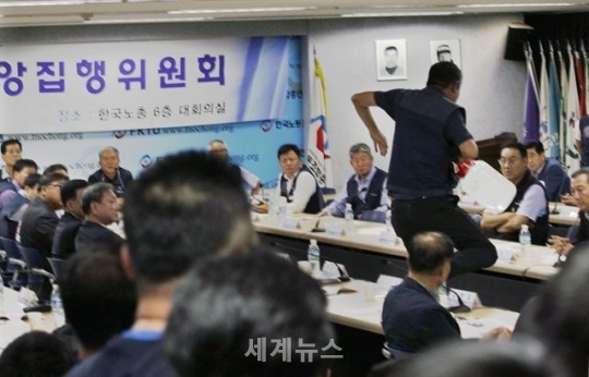 ▲14일 한국노총에서 열린 중앙집행위원회에서 노사정 대타협에 반대하는 김만재 금속노조 위원장이 시너통을 든 채 테이블을 뛰어넘고 있다. © 세계뉴스 |
