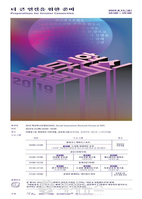 [세계뉴스] 조홍식 기자 = 서울혁신파크, 전주사회혁신센터, 춘천사회혁신센터, 대만 타이중사회혁신실험기지 등 국내외 대표적인 지역 사회혁신 기관들이 모여 오는 13일 서울혁신파크(서울시 녹번동)에서 ‘더 큰 연결(Preparations for Greater Connection)’을 주제로 ‘2019 혁신파크포럼’을 개최한다.