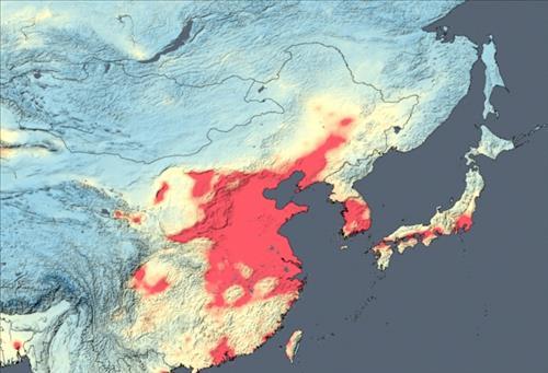 15일(현지시간) NASA가 공개한 고해상 위성 지도를 보면 중국 중서부의 광범위한 지역과 한국 대부분 지역이 최악을 의미하는 붉은색으로 표시됐다.