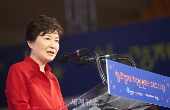 ▲ 박근혜 대통령이 대전 카이스에서 열린 '창조경제혁신센터 페스티벌' 개막식에 참석, 격려사를 통해 "17개 혁신센터가 본격 가동됨에 따라 혁신센터의 성과가 성장모멘텀이 돼 대한민국 전역에 창조경제가 뻗어 나갔으면 한다"고 말했다. © 세계뉴스 |