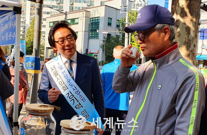 ▲ 김기덕 서울시의원이 ‘1일 현장수도사업소장’으로 위촉되어 성산시영아파트 정문 앞에서 지역주민들과 소통하며 안전하고 깨끗한 서울시 수돗물 ‘아리수’ 홍보를 하고 있다. |