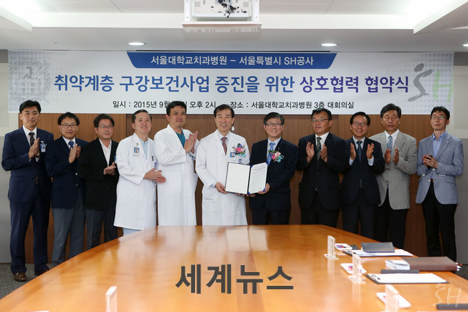 [서울=세계뉴스] 전승원 기자 = 서울시 SH공사 변창흠 사장은 15일 오후2시 서울대학교치과병원에서 류인철 서울대학교치과병원장과 서울시 취약계층을 대상으로 무료 치과치료 등 구강보건 증진사업를 펼치기 위한 양해각서(MOU)를 체결했다.