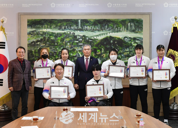 [세계뉴스 정서영 기자] 김현기 서울특별시의회 의장은 27일 제4회 항저우 장애인아시안게임에서 뛰어난 성적을 거둔 서울시 장애인 직장운동경기부 선수 7명에게 의장 표창을 수여했다.