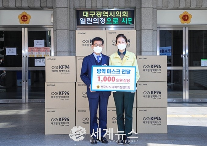 [세계뉴스 정서영 기자] 전국시・도의회의장협의회(회장 신원철)는 코로나바이러스 감염증-19(이하 코로나19) 피해로 인해 특별재난지역으로 선포된 대구·경북 지역에 지원하고자 마스크 14,000여장을 구매하여, 금일 대구광역시 의회에 7,000여장을 전달하고 나머지도 경북도의회에 금주 중 전달할 예정이다.