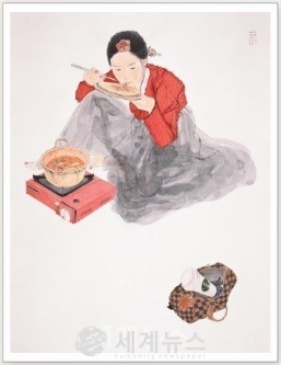 한편 김 작가의 작업 방식은 독특하다. 작품 속 주인공이 되어 사진 촬영을 한 뒤, 그 뒤에 옷을 입히는 방식이다. 촬영은 두 차례 걸쳐서 이뤄지는데 첫 촬영에서는 인체 실루엣을 찍고, 두 번째 촬영은 한복을 입고 첫 촬영과 같은 자세로 찍는다. 그런 다음 인물은 담채로, 사물은 진채로 표현하고 옷은 수묵 담채나 콜라주 기법으로 표현한다.