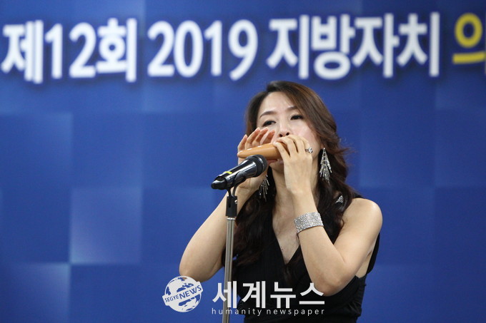 | ▲ 21일 오후 서울특별시의회 제2대회의실에서 열린 서울기자연합회 ‘제12회 2019 지방자치 의정·행정·경영·사회공헌 대상’ 시상식 오프닝 공연으로 한국실용음악협회 이예영 회장이 오카리나 악기로 ‘엘콘도파사 – 꽃의 축제’를 연주하고 있다. |