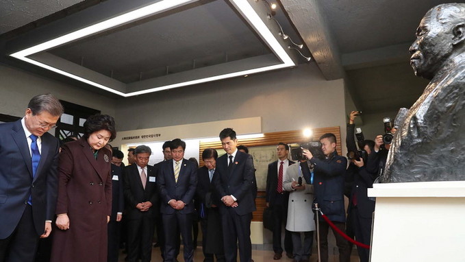 ▲ 문재인 대통령은 중국 국빈 방문 마지막날인 16일 충칭 첫 일정으로 대한민국 임시정부 충칭 청사를 찾았다. 이날 문 대통령은 김구 선생의 흉상에 헌화를 한 후, 전시실 안내자의 설명을 들으며 임시정부의 발자취를 돌아봤다. © 세계뉴스 |