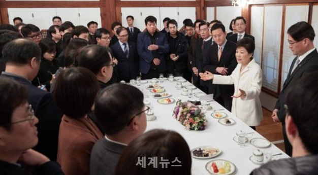 ▲ 박근혜 대통령이 1일 청와대 상춘재에서 출입기자단과 신년 인사를 겸한 티타임을 하고 있다. © 세계뉴스 |