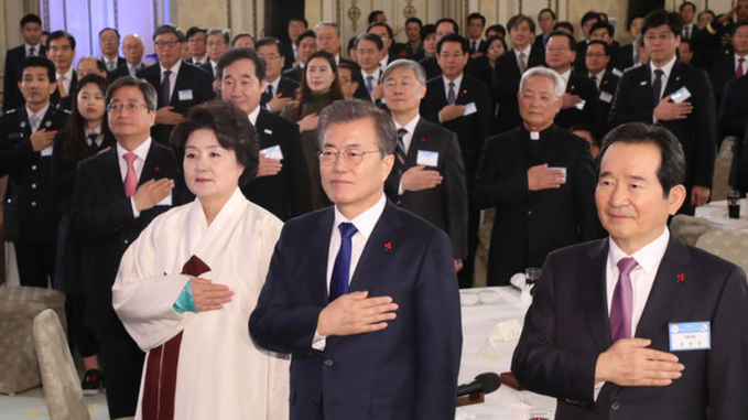 ▲ 2일 '문재인 대통령과 함께하는 2018 무술년 신년회'에서 국민의례를 하고 있는 참석자들. © 세계뉴스 |