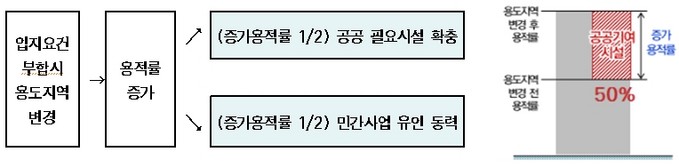 용도지역 상향은 역세권의 중심지체계·입지특성 등을 반영하여 최대 3단계까지 조정할 수 있도록 하되, 용도지역 변경으로 증가되는 용적률의 1/2을 공공기여토록 하여 해당 지역에 필요한 공공시설·기반시설을 비롯해 공공임대시설(주택·오피스·상가) 등을 공급할 수 있다.